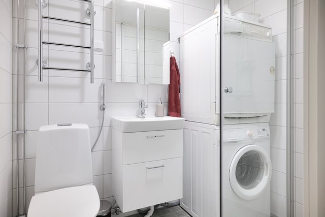 - WC-istuin, suihku, suihkuseinä (2 kpl), pesukoneliitäntä, lattialämmitys, peilikaappi, ja rättipatteri