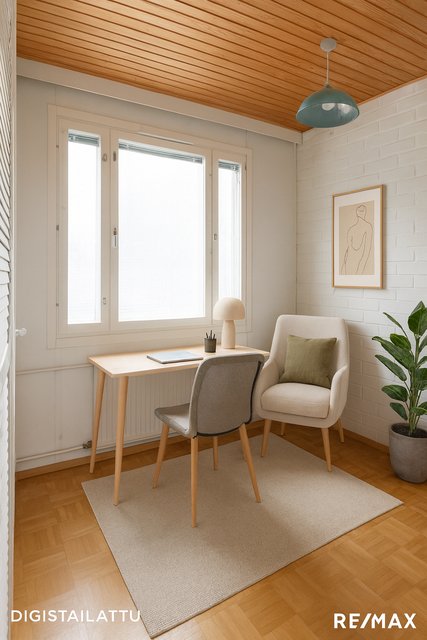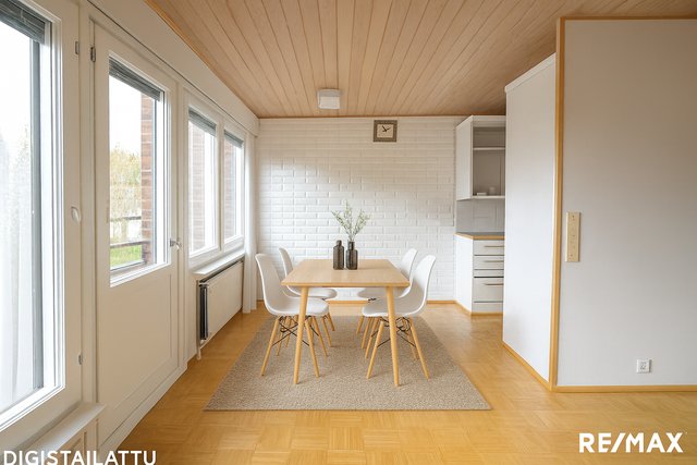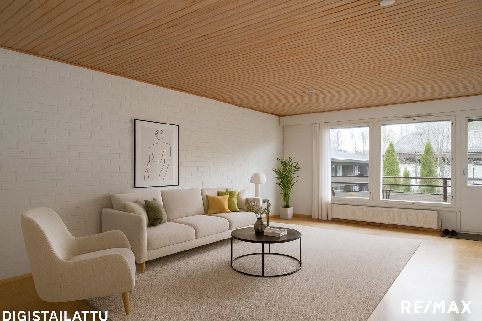 Tämä tilava rivitalon päätyhuoneisto tarjoaa viihtyisän ja toimivan kodin, jossa on viisi huonetta, keittiö ja sauna. Kodin tilat on suunniteltu arjen mukavuutta ja yhteisiä hetkiä varten.
