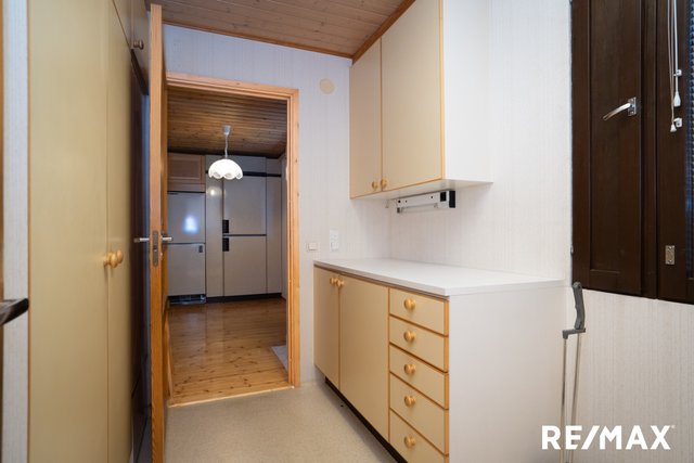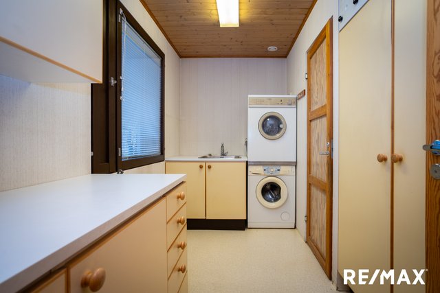 - Kuivausrumpu, pesukone, pesukoneliitäntä, pöytätaso, pesuallas, lattialämmitys, ja tila pesutornille