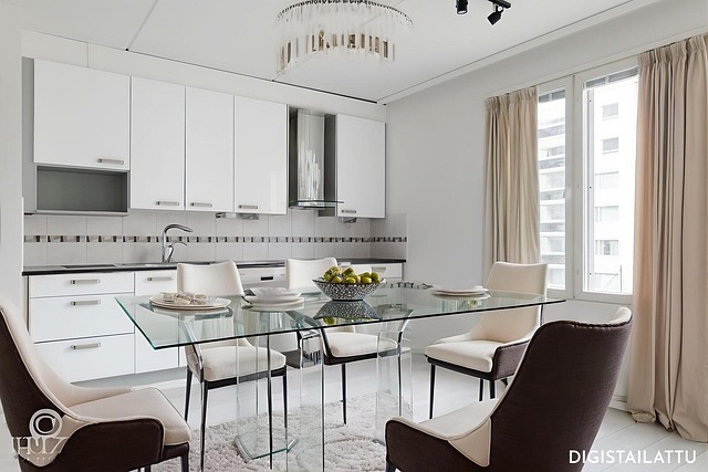 - Keraaminen liesi/ uuni, liesituuletin, astianpesukone, jääkaappi/ pakastin. Keittiössä tilaa ruokailuryhmälle.