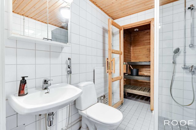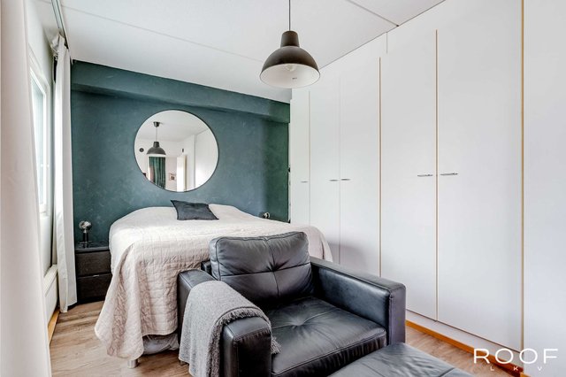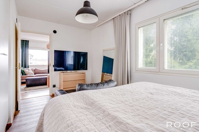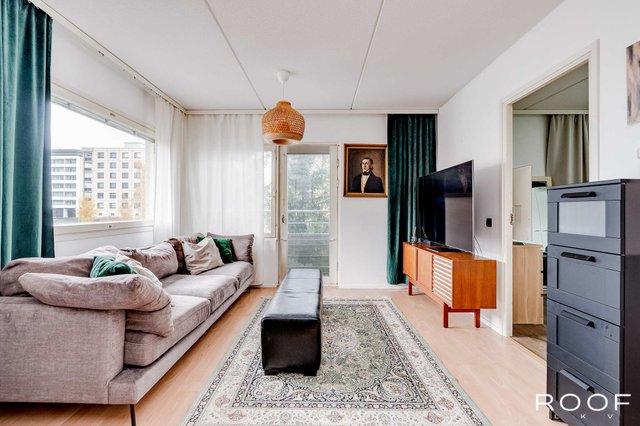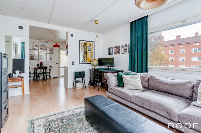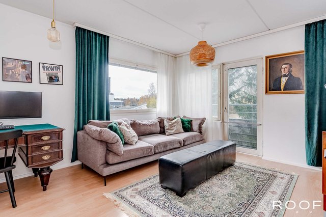 Nyt tarjolla erittäin keskeiseltä sijainnilta tilava saunallinen huoneisto. Tämä toisen kerroksen asunto tarjoaa toimivan pohjaratkaisunsa lisäksi väljyyttä asumiseen runsaiden neliöidensä ansiosta. Valoisa olohuone yhdistyy toivotusti keittiön kanssa ja näin luoden toimivan kokonaisuuden. Olohuoneeseen saa mahtumaan isommankin sohvaryhmän sekä keittiöön kunnon ruokapöydän. Olohuoneesta kulku makuuhuoneeseen, jossa runsaasti kaappi- ja säilytystilaa. Kylpyhuone- ja saunaosastossa tilaa myös kodinhoidolle.