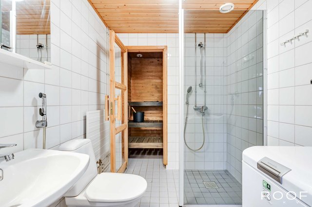 - WC-istuin, suihku, suihkuseinä, ja pesukoneliitäntä