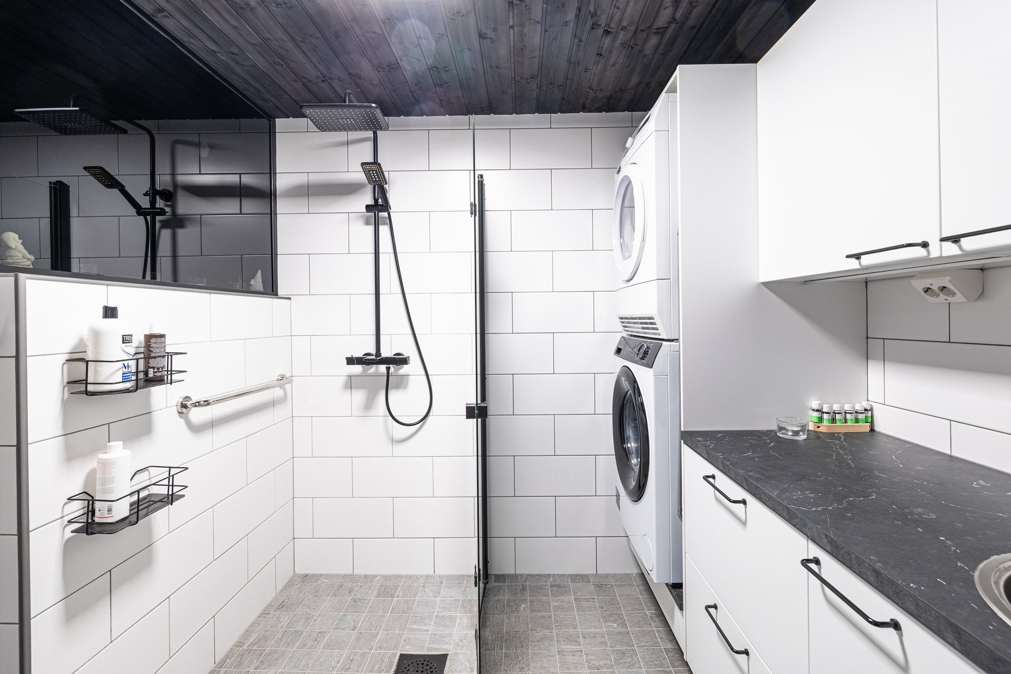 - Suihku, suihkuseinä, lattialämmitys, pesukone (2025), kuivausrumpu, pesuallas, ja pesukoneliitäntä