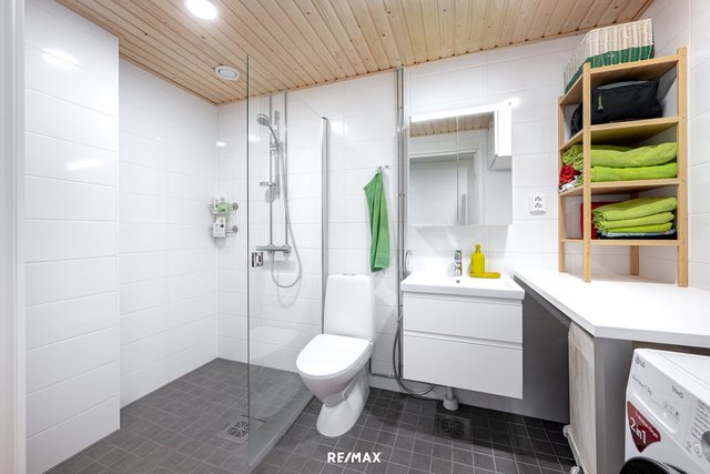 - - WC - Suihku - Suihkuseinä - Peilikaappi - Allaskaappi - Työtaso - Pesukoneliitäntä Lattia ja seinät laatoitettu