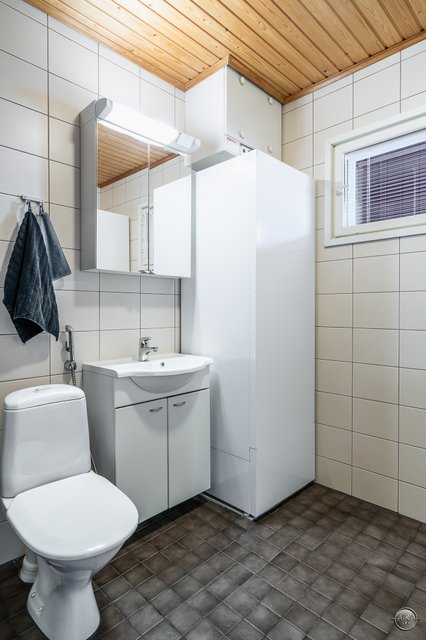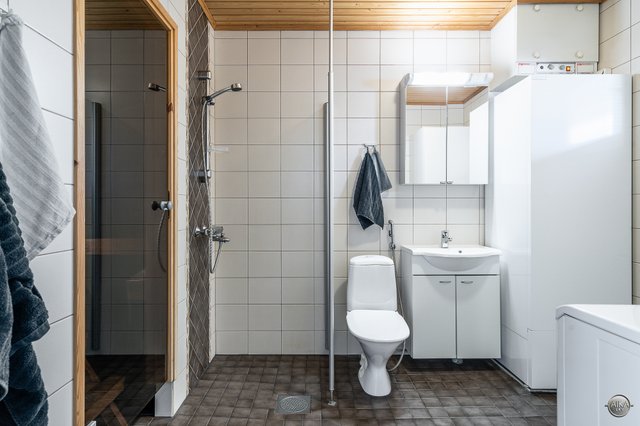 - Suihku, pesukoneliitäntä, allaskaappi, peilikaappi, ja kylpyhuonekaapistot