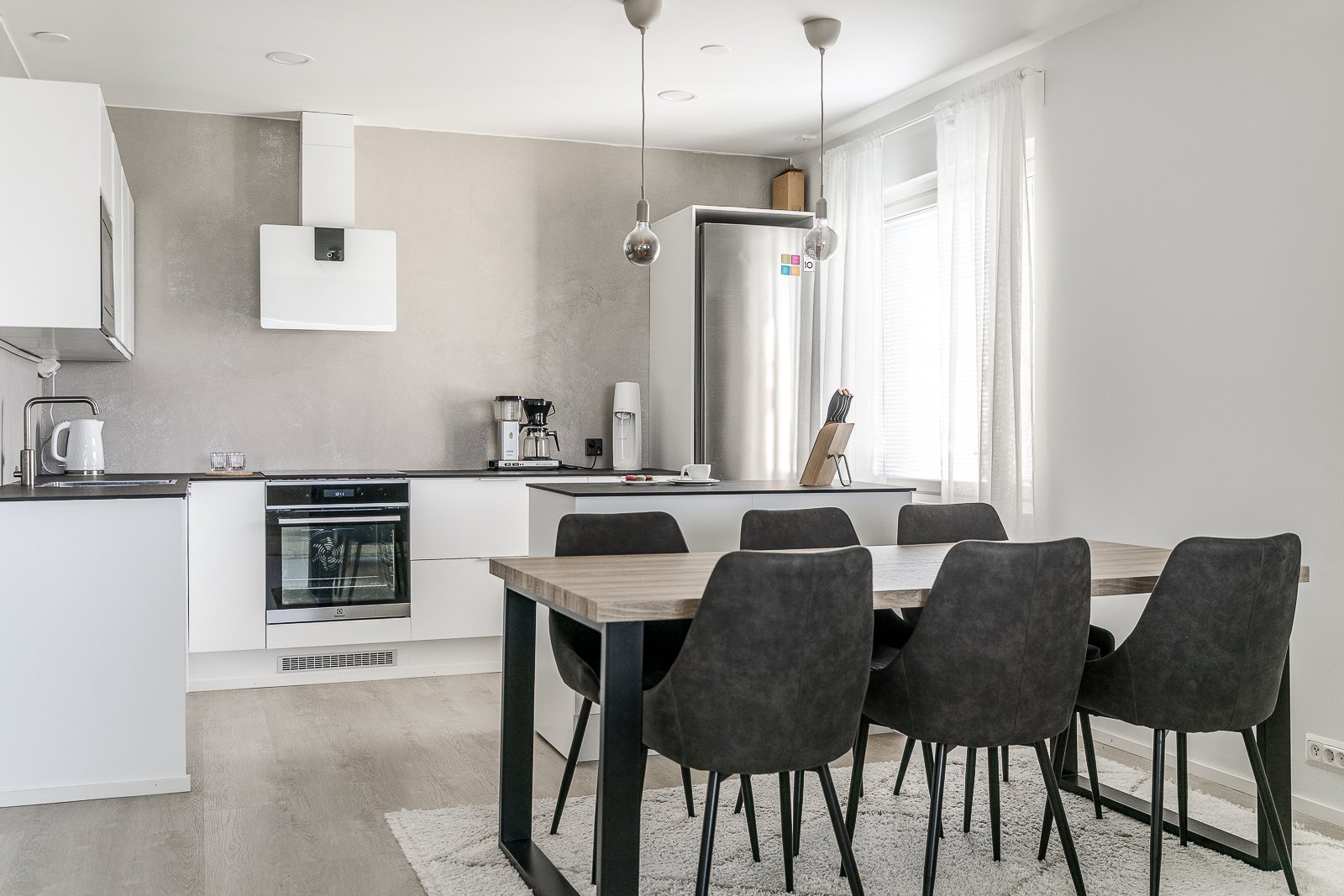 - Uusittu 2022. Lattia vinyyli (karitma). Työtasot täyslaminaatti, tausta hartsipinnoite (Belle Artin), katossa upotetut ledit, lattian sävy greige mm.