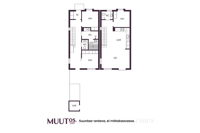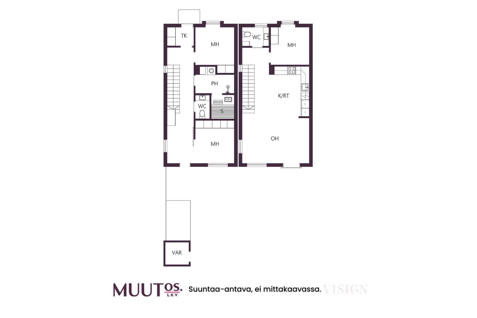 Pohjaratkaisussa oleskelutilat on tuotu mukavasti tällä kertaa yläkertaan. Tilava asunto tarjoaa erinomaisen kodin joko lapsiperheelle tai väljää asumista arvostavalle pariskunnalle. Asunnon tilat ovat kahdessa tasossa: Alakerrasta löytyvät tilavan eteisen sekä kahden makuuhuoneen lisäksi pesutilat ja erillinen wc. Terassille ja takapihalle kulku tapahtuu alakerran kautta, josta löytyy myös huoneiston varasto. Yläkerrassa on yhden makuuhuoneen sekä erillisen wc:n lisäksi todella avara olohuone, johon avokeittiö yhdistyy. Tämä ratkaisu tekee tilasta monikäyttöisen sekä helposti muokattavan. Etätyöpiste huoneistossa järjestyy näppärästi avointen rappusten alle sekä yläkerrastakin löytyy yksi mainio erillinen nurkkaus työpisteen asettelulle. Säilytystilaa on reilusti kahden eri varaston ansiosta. Toinen on lämmin ja toinen kylmä.