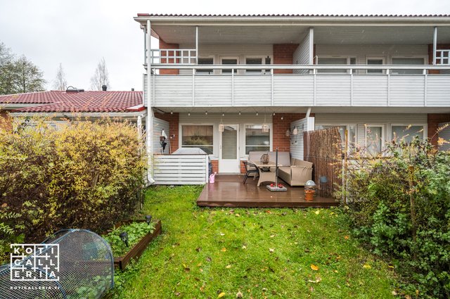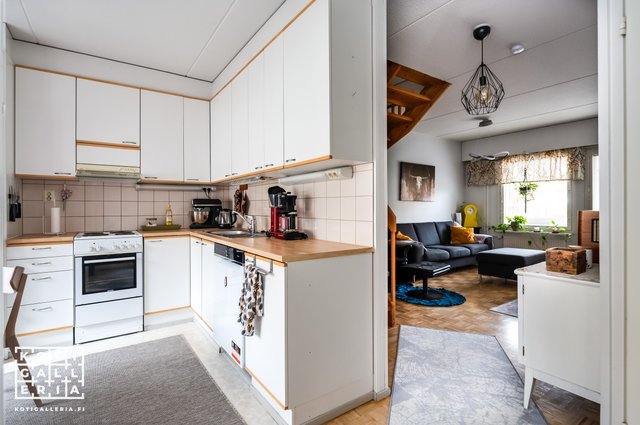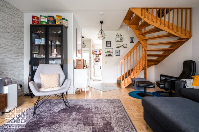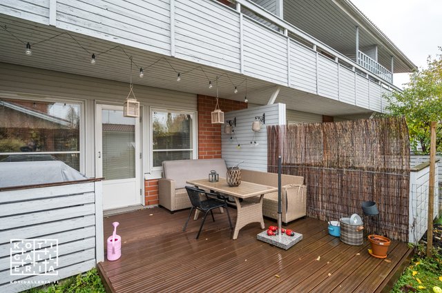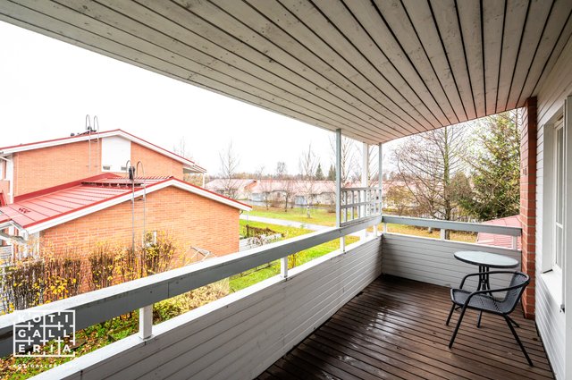 Alakerrassa sijaitseva keittiö on kätevästi heti sisäänkäynnin yhteydessä ja olohuoneesta pääsee sujuvasti terassille nauttimaan ulkoilmasta. Yläkerrassa sijaitsee kaksi hyvän kokoista makuuhuonetta, joista toisesta on käynti isolle parvekkeelle.