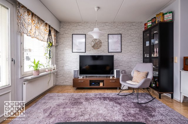 - Olohuoneessa ja eteisessä parkettilattia, muualla muovimatto