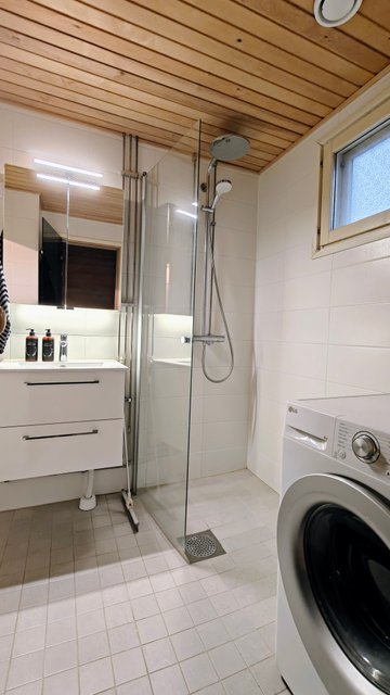 - Kylpyhuone täysin remontoitu 2021. Seinät ja lattia laatoitettu, lattialämmitys. Käsisuihku, sadettajasuihku, suihkuseinä, käsienpesuallas, allas- ja peilikaappi, wc-istuin, pesukoneliitäntä/tilavaraus, ikkuna.