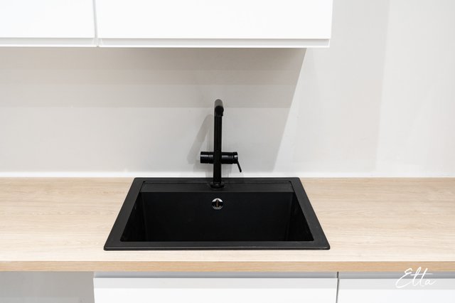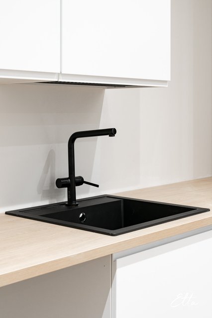 - Kodinhoitohuoneessa on kaapistot, pesuallas sekä hana ja pesukoneliitäntä. Lattia laattaa ja seinät maalattu.