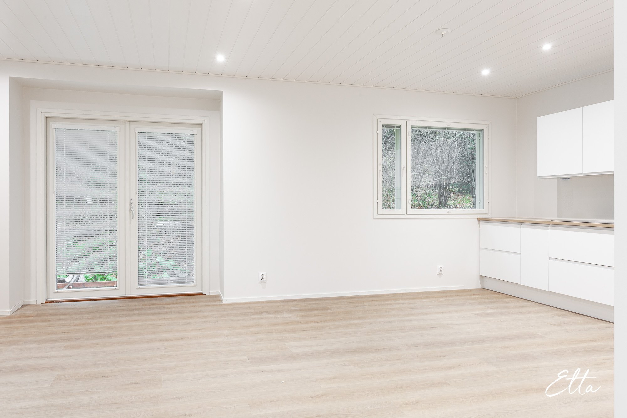 Asunnon avarat ja valoisat tilat luovat viihtyisän ilmapiirin. Olohuoneesta avautuvat pariovet johtavat terassille, josta avautuu kaunis näkymä metsäiselle takapihalle – täydellinen paikka rentoutua ja nauttia luonnon rauhasta. Keittiö on varustettu nykyaikaisesti ja sen käytännöllisyys ilahduttaa niin arjen kiireissä kuin viikonlopun kokkailuhetkissä.