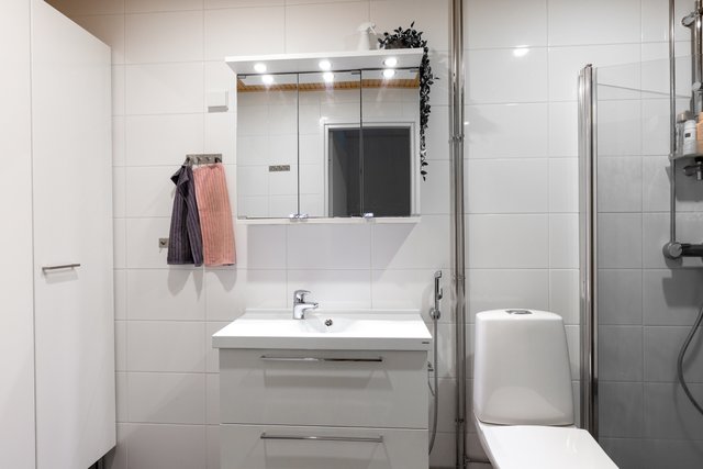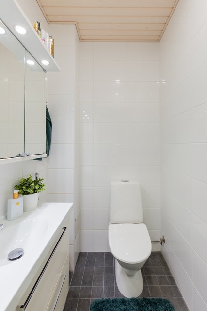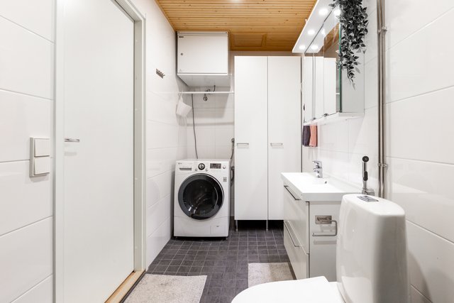 - WC-istuin, suihku, pesukoneliitäntä, peilikaappi, pesuallas, allaskaappi, ja bidee-suihku