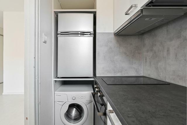 - Vaaleasävyinen keittiö pienellä ikkunalla. Keraaminen liesitaso, erillisuuni, liesituuletin, jääkaappi ja pesukone.