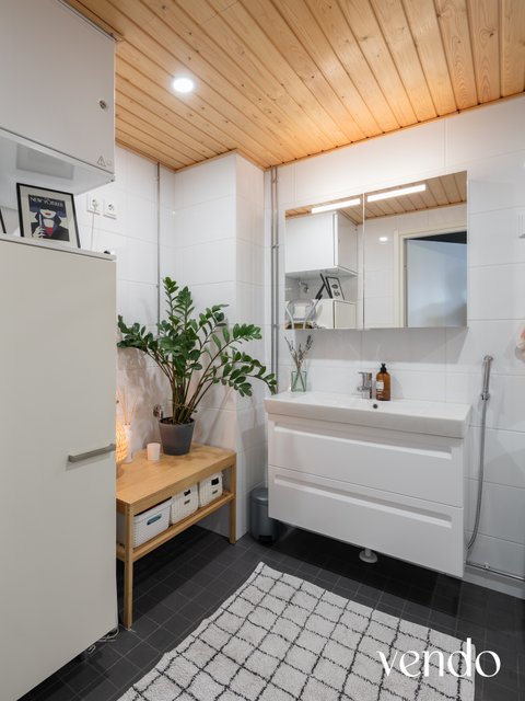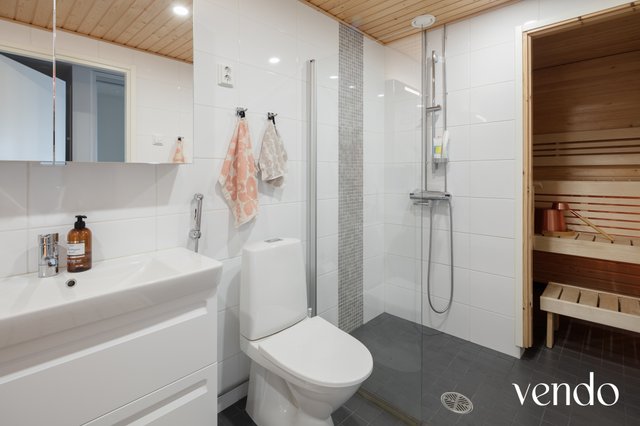 - WC-istuin, suihku, suihkuseinä, pesukoneliitäntä, lattialämmitys, peilikaappi, pesuallas, allaskaappi, ja bidee-suihku