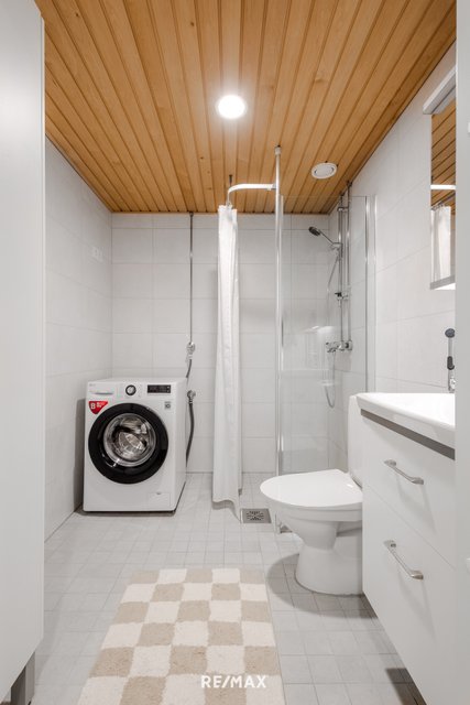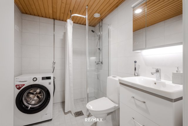 - WC-istuin, suihku, suihkuseinä, pesukoneliitäntä, peilikaappi, bidee-suihku, allaskaappi, lattialämmitys, ja kaappi