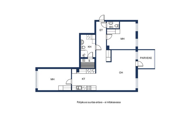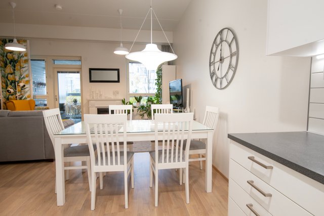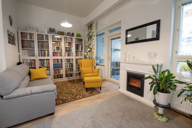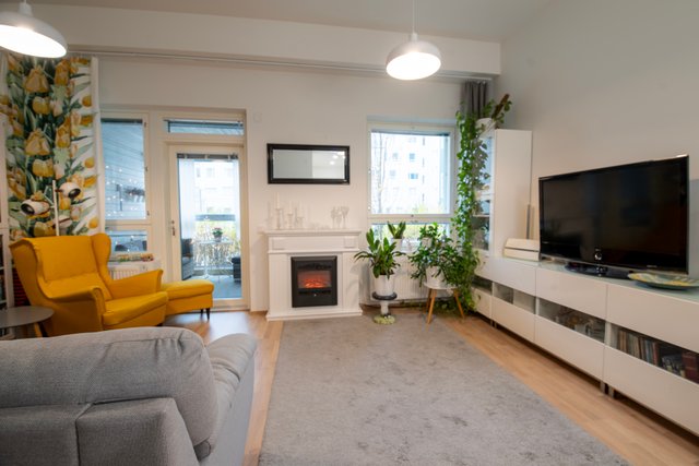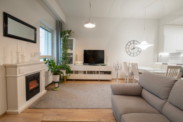 Asunnossa on kaksi mukavan kokoista makuuhuonetta, tilava olohuone ja hyvin varusteltu keittiö, saunaa unohtamatta. Kylpyhuoneessa on tilaa isolle pyykinpesukoneelle, ja erillinen WC lisää arjen sujuvuutta.