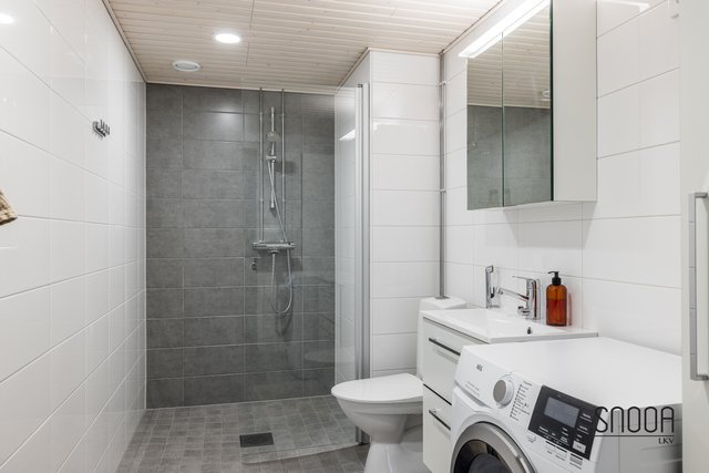 - WC-istuin, suihku, suihkuseinä, pesukoneliitäntä, lattialämmitys, peilikaappi, peili, pesuallas, allaskaappi, ja bidee-suihku