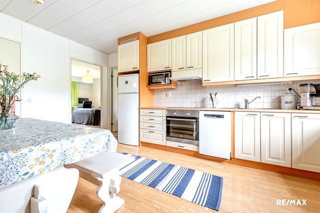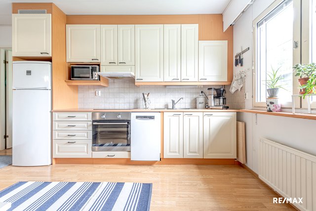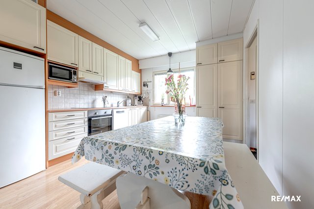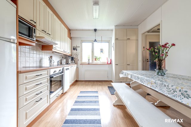 Kodinkoneet, keittiön lisävalo, eteläpäädyn ulkovuorilaudat huoltomaalattu.