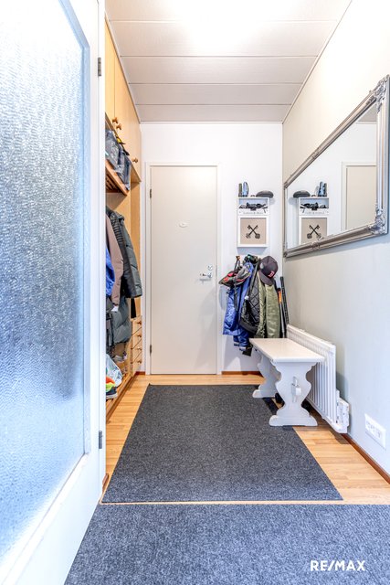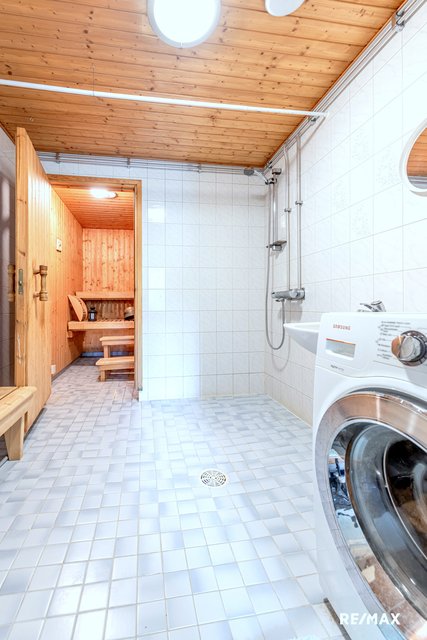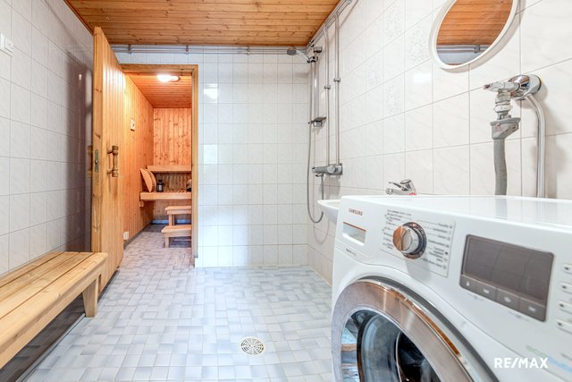 - Suihku, pesukoneliitäntä, lattialämmitys, pesuallas, ja kaappi