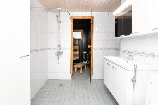 - WC-istuin, suihku, pesukoneliitäntä, peilikaappi, pesuallas, allaskaappi, ja bidee-suihku
