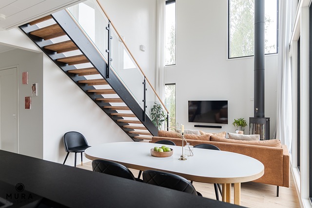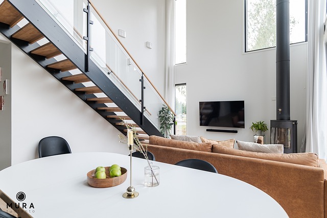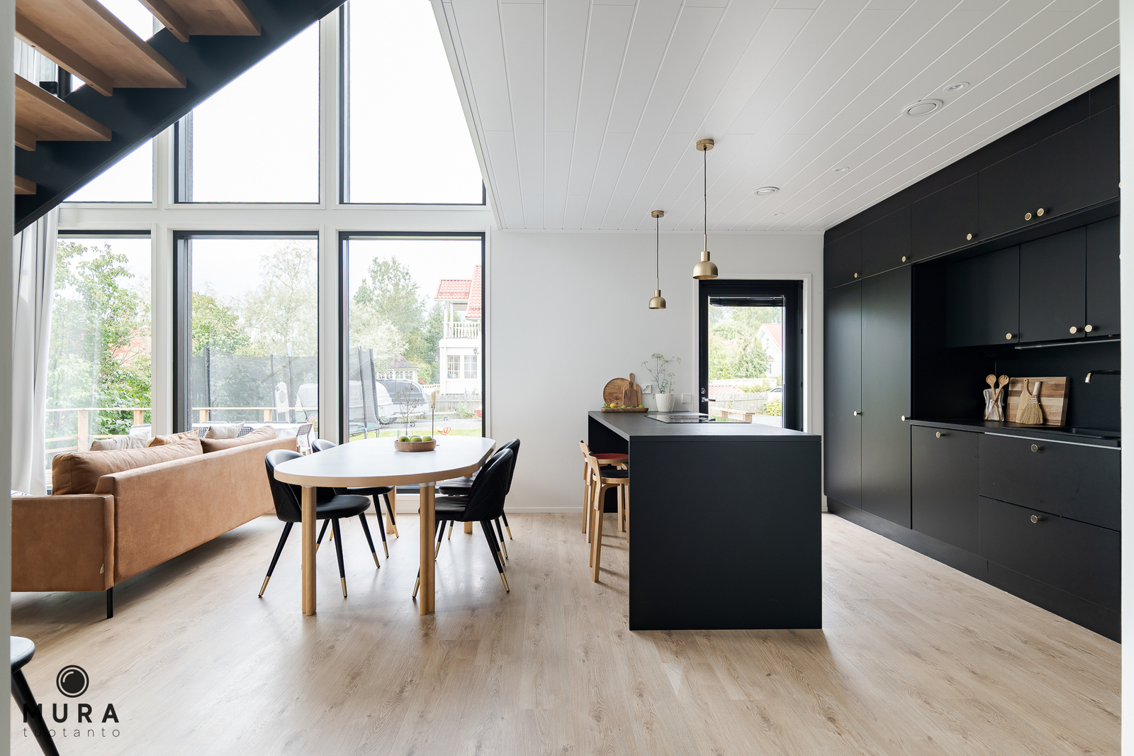Alakerrassa on moderni yhtenäinen keittiö-ruokailutila sekä olohuone josta kulkee näyttävät portaat yläkertaan, sekä upea kahden kerroksen korkuinen tila suurine ikkunoineen. Olohuoneessa on myös lämpöä kuin tunnelmaa luova takka, sekä käynti terassille jossa voit nauttia vaikkapa aamukahvit.