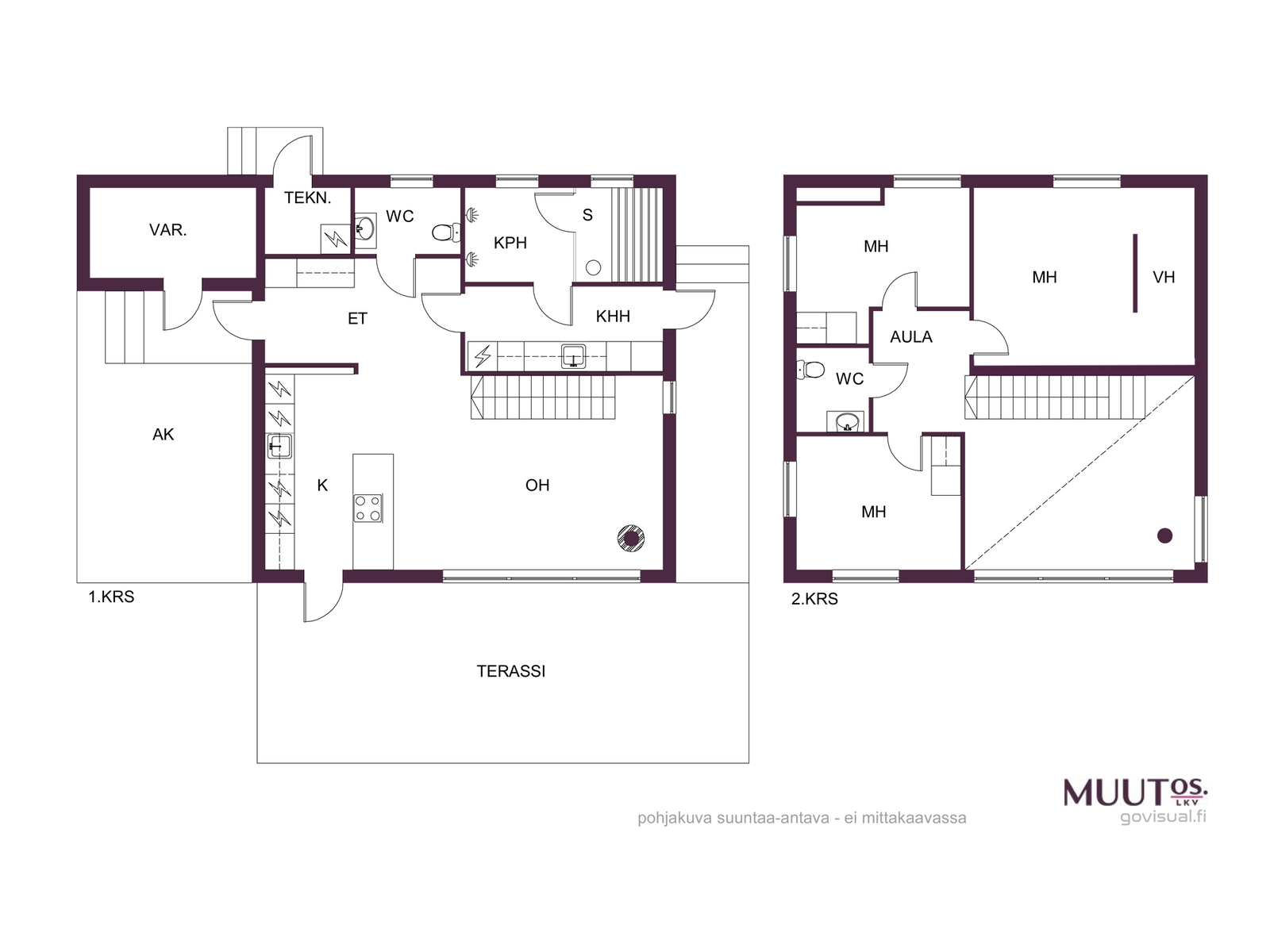 - Pohjapiirrustuksen mukaan huoneistoala on 113m2, kerrosala ulkomitoilla 142m2, kerrosala 250mm mukaan 135m2. Asuintiloihin on laskettu mukaan tekninen tila. Rakennuspiirrustuksista yhteenlaskettuna asuinpinta-ala on 100,3m2, johon ei sisälly varastoa eikä teknistä tilaa. Ilmoitettuun muihin tiloihin sisältyy varasto. Hinta ei ole pinta-ala perusteinen.