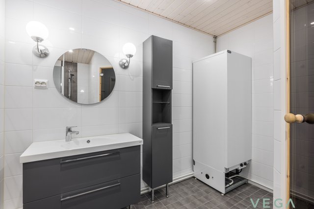 - Kylpyhuone ja wc-tilat, sekä lämminvesivaraaja on uusittu. Varustus: Suihku, suihkuseinä, peili, pesuallas, allaskaappi, pesukoneliitäntä, valaisimet, kylpyhuonekaappi, lattialämmitys, lämminvesivaraaja. Seinät ja lattia laatoitettu.