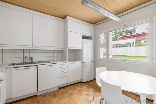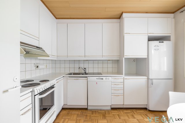 - Jääkaappi/pakastin, liesi, liesikupu, astianpesukone, kaapistot. Seinät tapetti, parkettilattia.