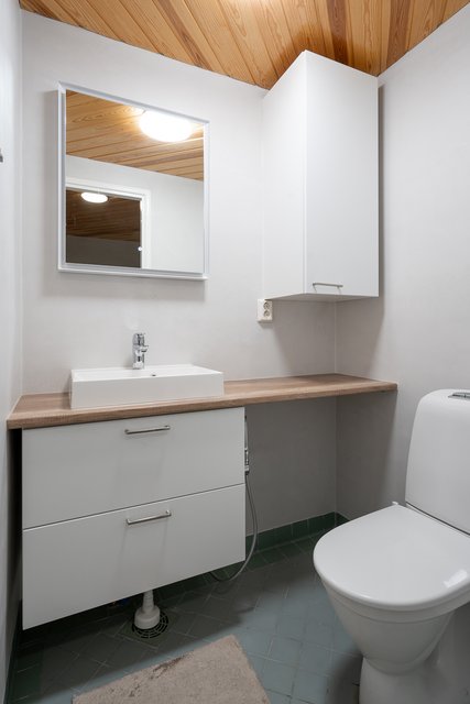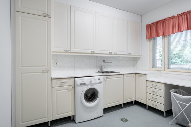 - Pesukoneliitäntä, lattialämmitys, lattiakaivo, pyykkikaapit, ja pöytätaso