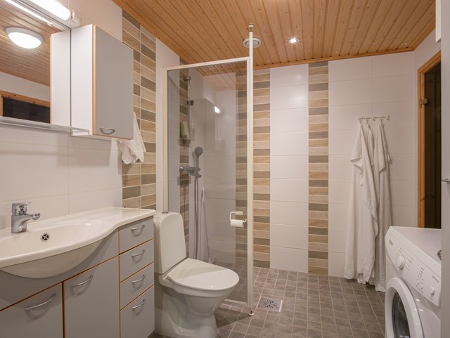 - WC-istuin, suihku, suihkuseinä, pesukoneliitäntä, peili, lattialämmitys, pesuallas, allaskaappi, ja bidee-suihku