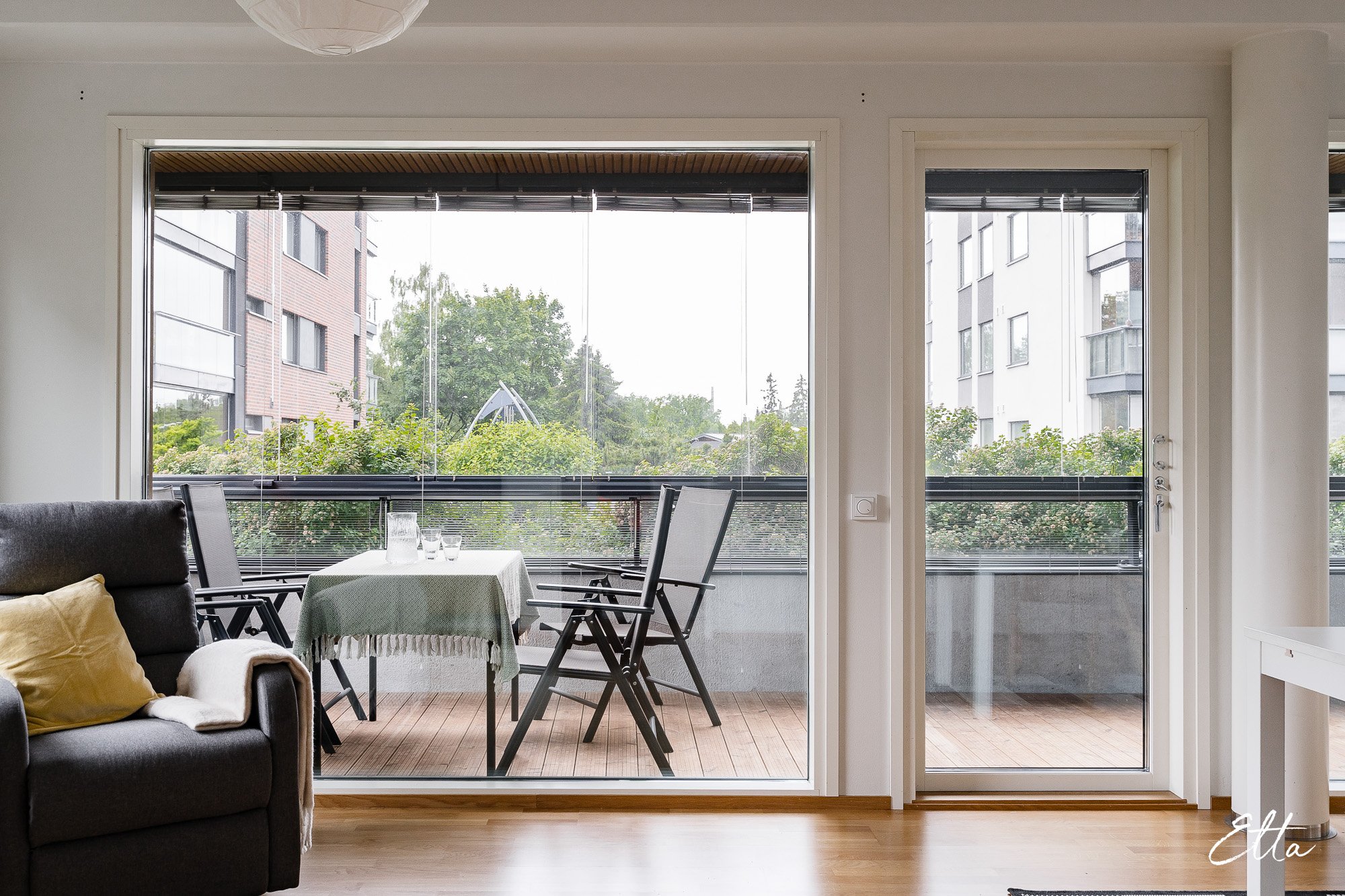 Asunnon vaalea avokeittiö saarekkeella yhdistyy saumattomasti olohuoneeseen, luoden avaran ja kutsuvan oleskelutilan. Suuret ikkunat tuovat runsaasti luonnonvaloa sisään ja liittävät sisä- ja ulkotilat yhteen luontevasti. Lasitetulla 15m2 parvekkeella voi nauttia aamukahvista aikaisin keväästä pitkälle syksyyn. Tilava kylpyhuone ja oma sauna lisäävät asumisen mukavuutta ja säilytystilaa kodissa on reilusti liukuovien taakse kätkettynä.