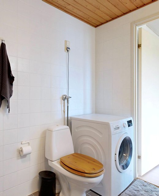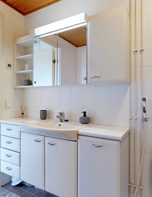 - VARUSTUS: Suihku, Suihkuseinä, WC-istuin, Pesukoneliitäntä, Allaskaappi, Hana, Allas, Peilikaappi, Lattialämmitys. SEINÄ: Laatta. LATTIA: Kaakeli.