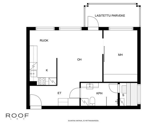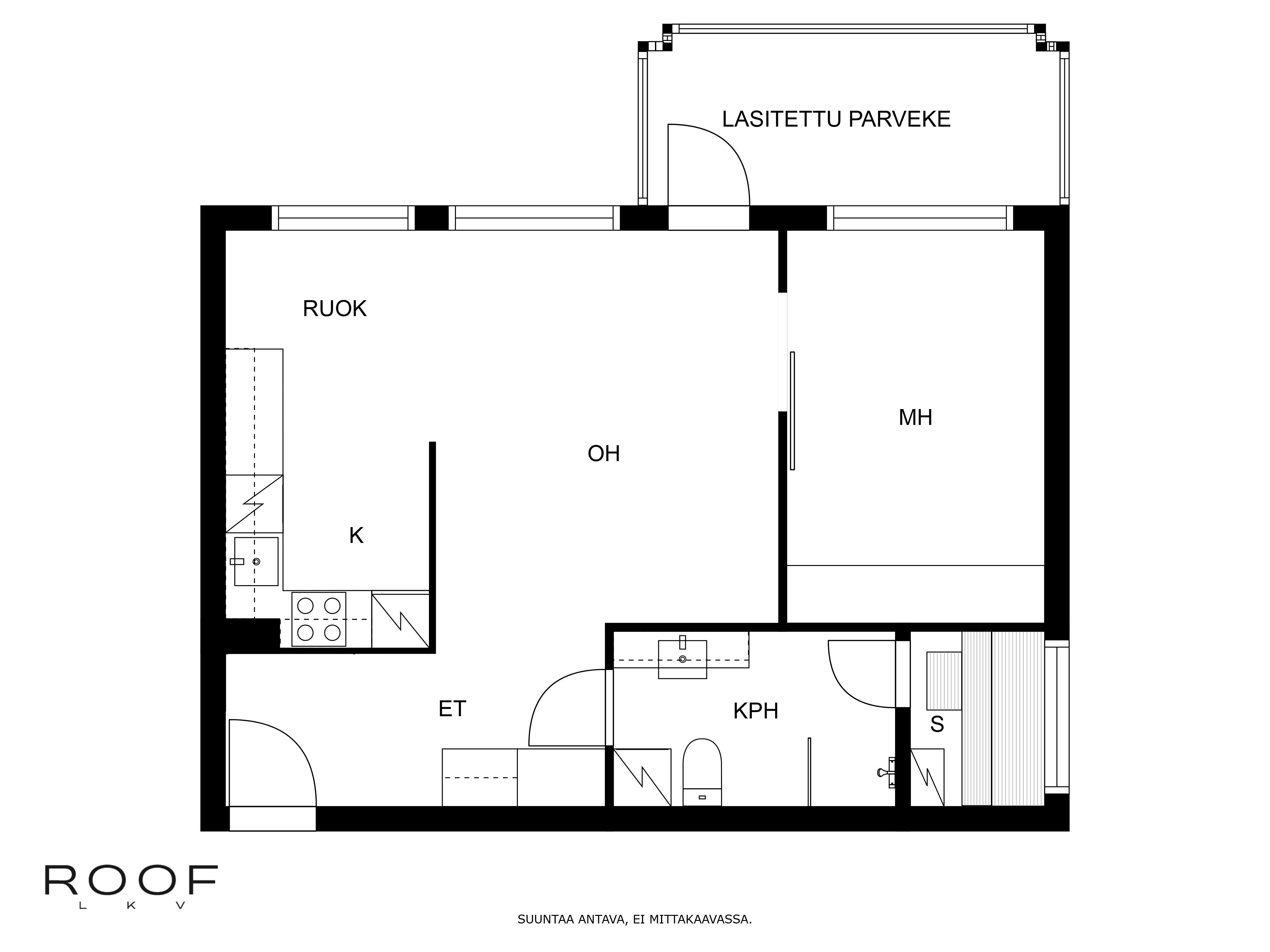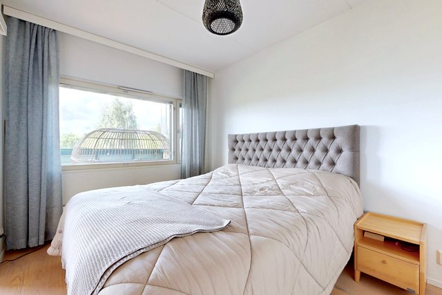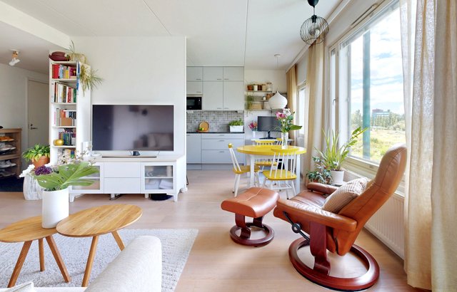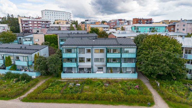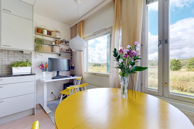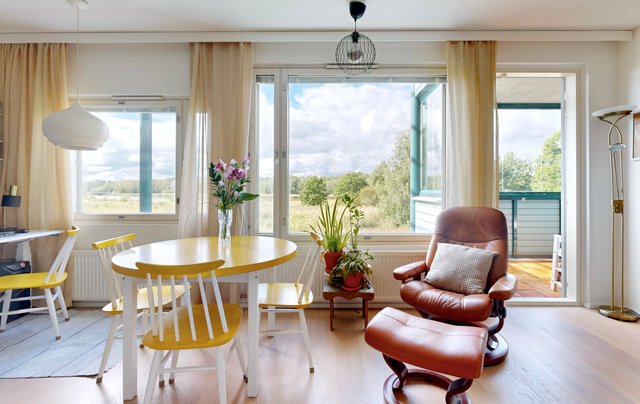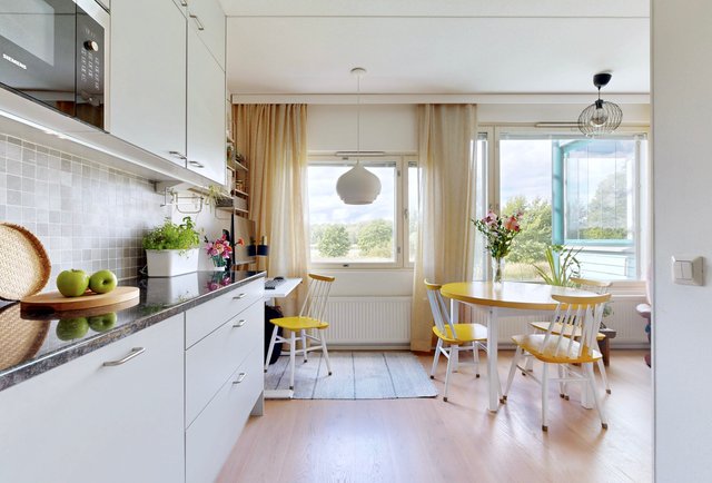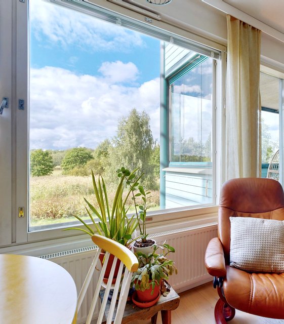 Avarapohjainen koti, jossa isot ikkunat tuovat valoa. Lasitetulla parvekkeella voi nauttia merinäkymistä. Vaalea keittiö, jossa hyvin kaappi- ja laskutilaa. Makuuhuoneessa ja eteisessä kaapistot. Tilava kylpyhuone, jossa paikka pyykinpesukoneelle. Oma sauna.