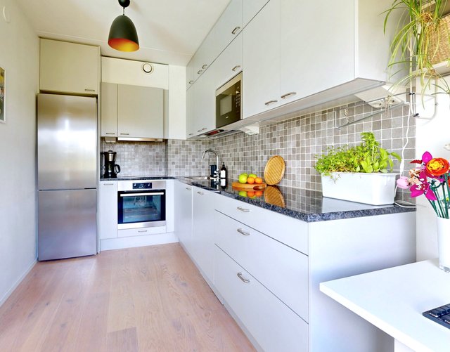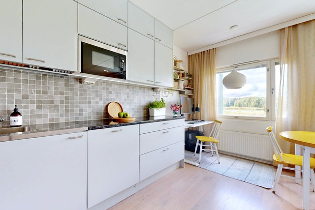 - VARUSTUS: Induktioliesi, Erillisuuni, Liesituuletin, Hana, Kaapisto, Allas, Astianpesukone, Jääkaappipakastin, Integroitu mikroaaltouuni. TYÖTASO: Kivitaso. LATTIA: Parketti. SEINÄT: Välitila laatta. Maalattu.