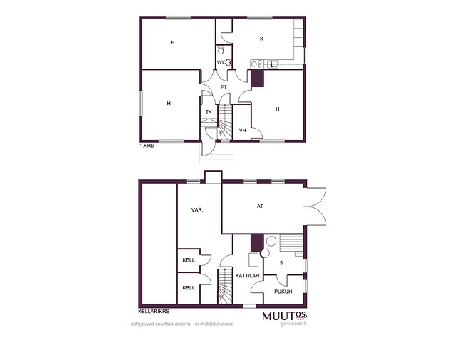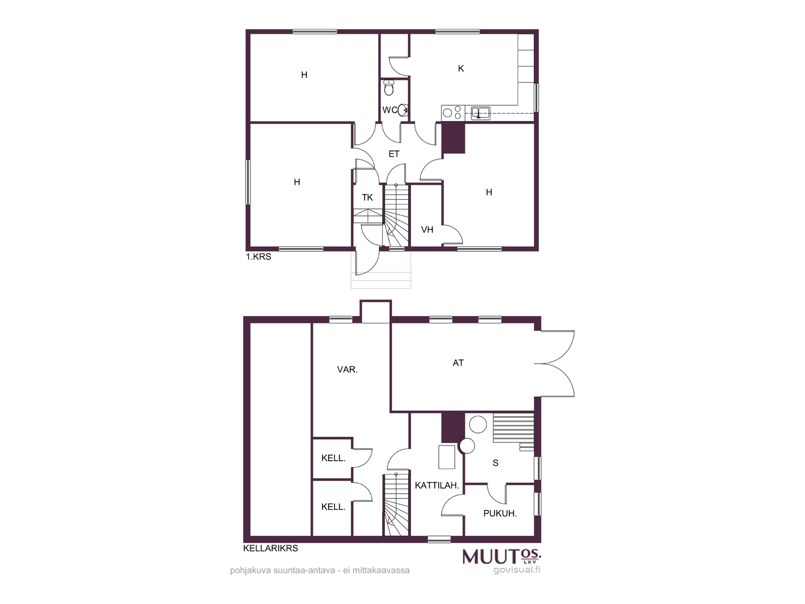 - Pinta-alat perustuvat myyjältä saatuihin tietoihin ja rakennuspiirustuksista laskettuihin arvioihin. Pinta-aloja ei ole tarkistusmitattu, mitattaessa pinta-alat saattavat olla ilmoitettua suurempia tai pienempiä. Kohteen kauppahinta ei ole osaksikaan pinta-alaperusteinen vaan perustuu kokonaisuuteen. Rakennusluvan mukainen huoneistoala 96 m2. Asuintilojen pinta-ala on laskettu rakennuspiirustuksista ja siihen on huomioitu kaikki asuinkäytössä olevat tilat, muihin tiloihin on laskettu kellarikerros.