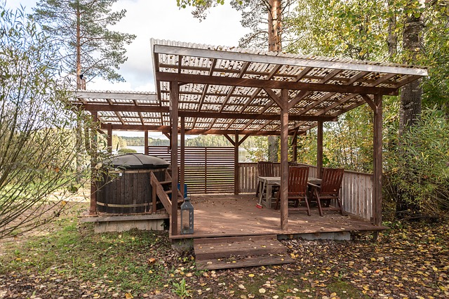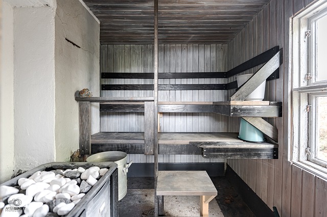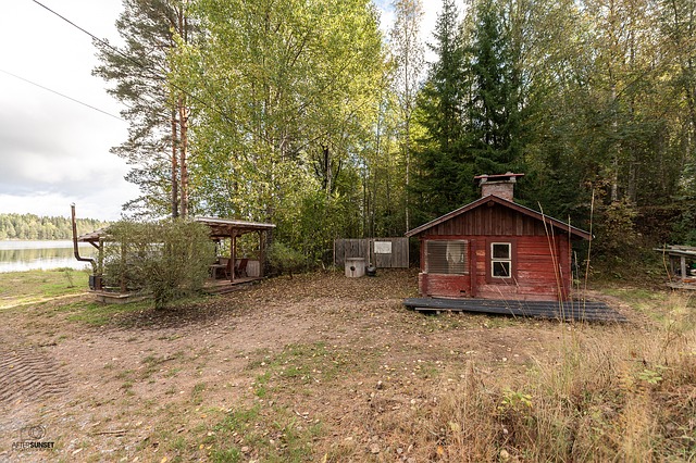 Vanha hirsisauna, grillikatos ja savusaunan kehikko odottelee rannassa seuraavaa puuhastelijaa. Rantasaunan viereisestä rengaskaivosta saa vettä saunalle.