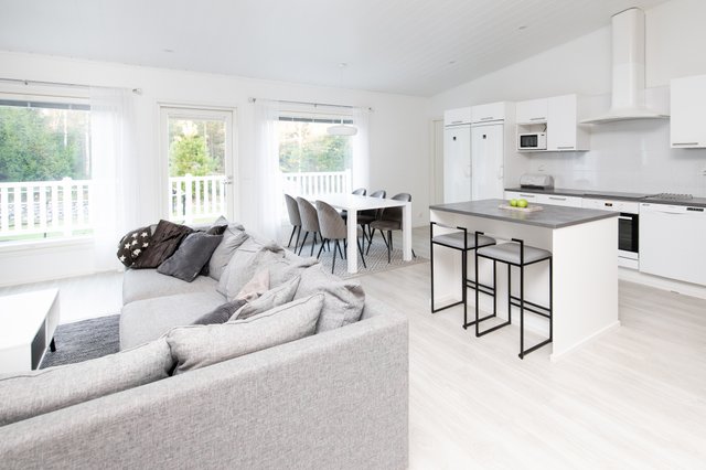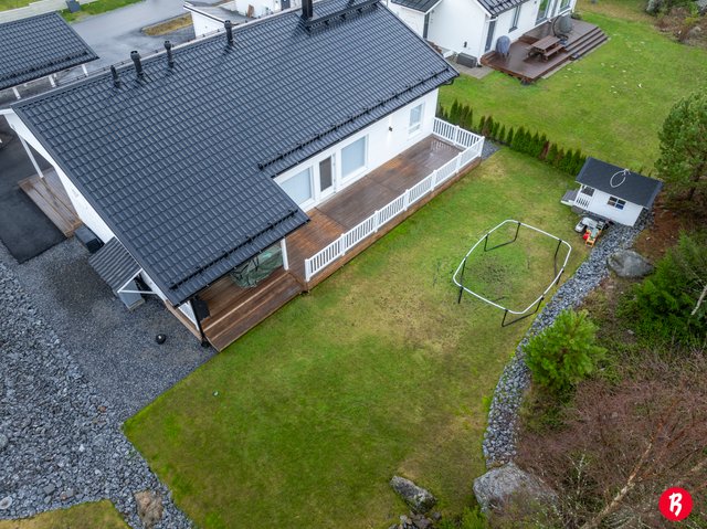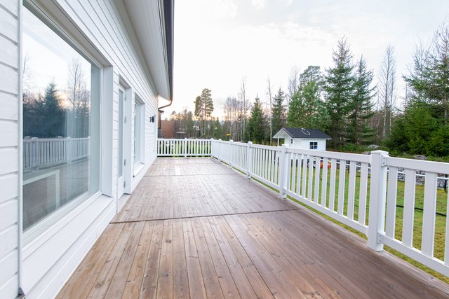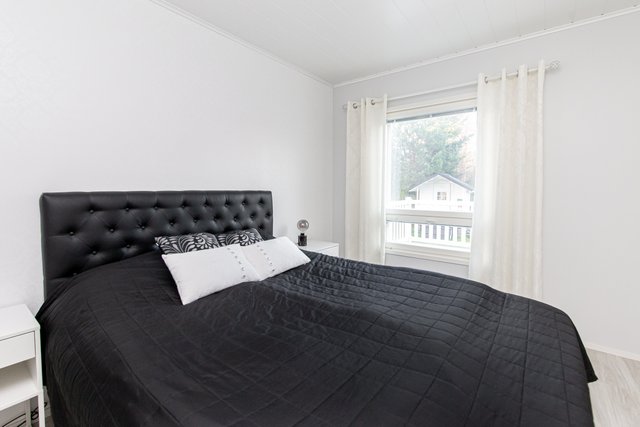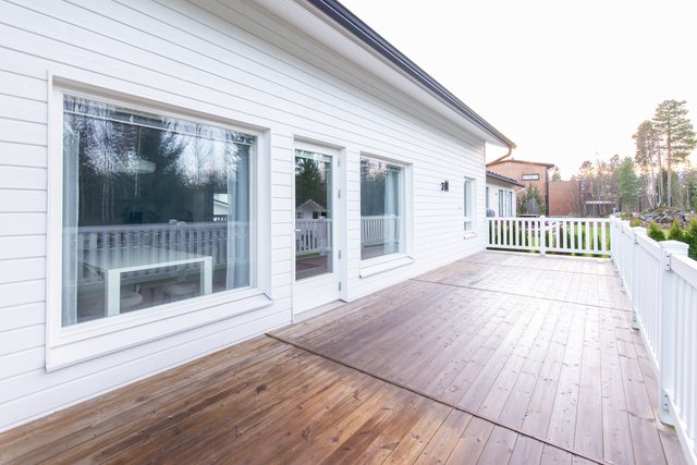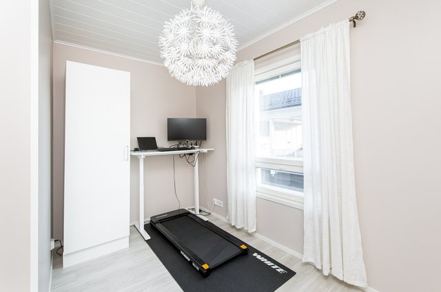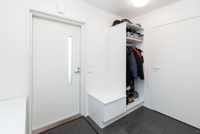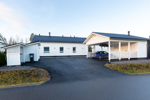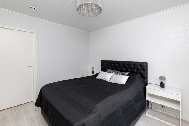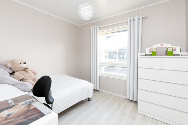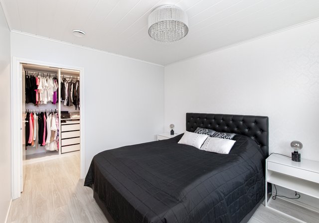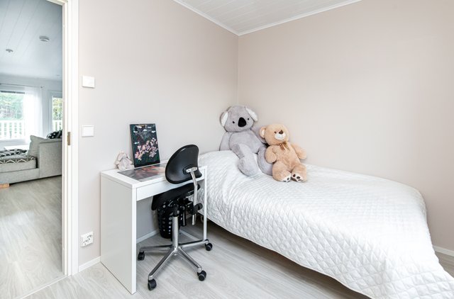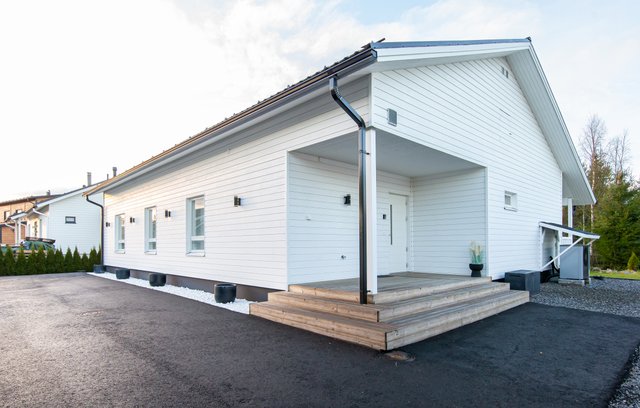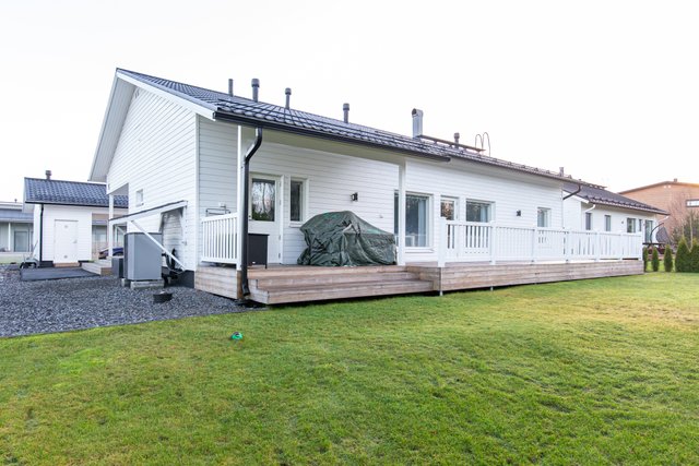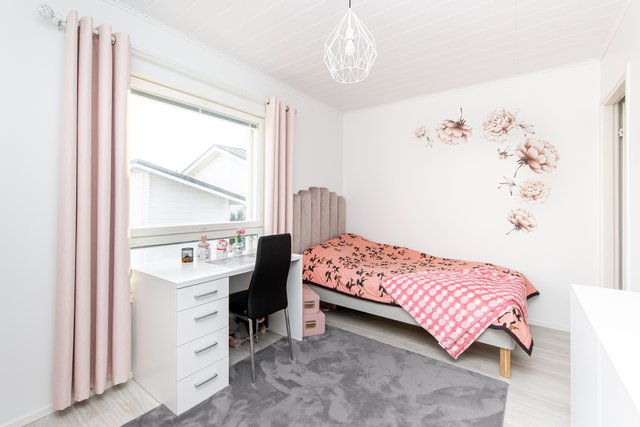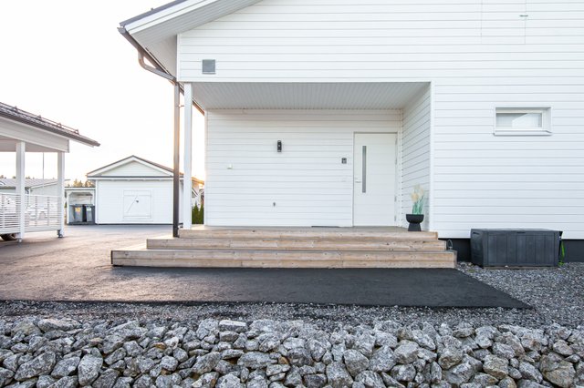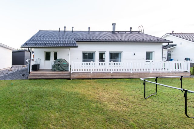 Husets trevliga och funktionella planlösning är designad för familjens behov, med fyra sovrum, två separata toaletter och ett rymligt grovkök med egen utgång. Köket är utrustat med moderna apparater och en köksö, vilket gör det till en perfekt plats för familjens gemensamma matlagningsstunder. Vardagsrummets och kökets enhetliga utrymme skapar en trevlig atmosfär för umgänge. Utanför finns en rymlig terrass som inbjuder till att njuta av sommardagarna och ett varmt förråd på gården erbjuder gott om förvaringsutrymme.