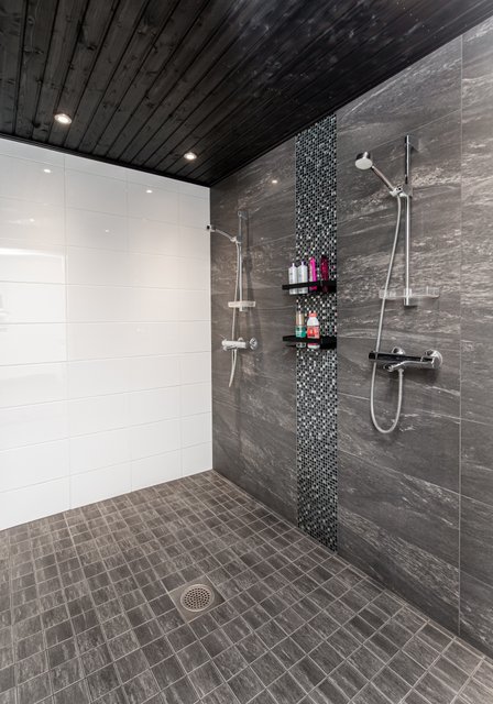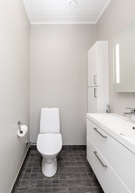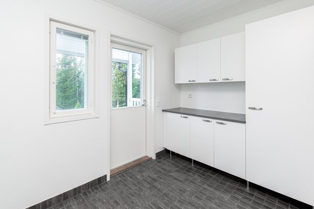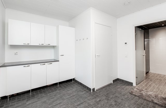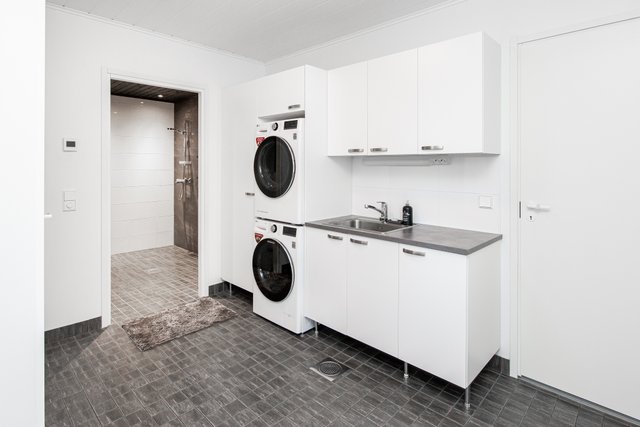 - Lattialämmitys, pesukoneliitäntä, lattiakaivo, pesuallas, lastenhoitopöytä/taso, pöytätaso, keskuspölynimuri, ja tila pesutornille
