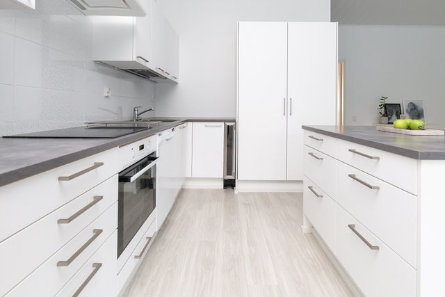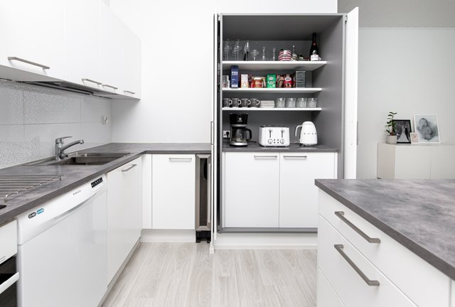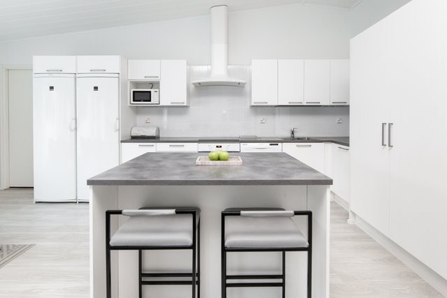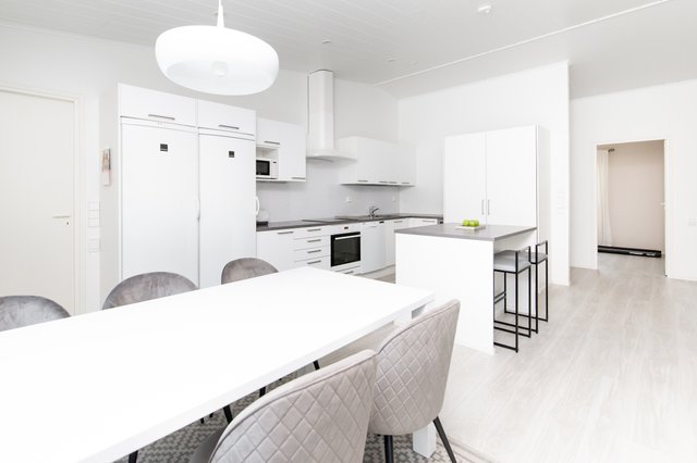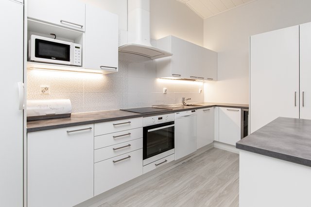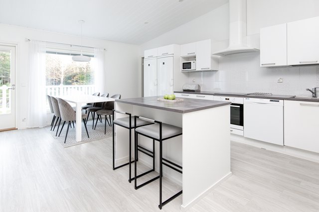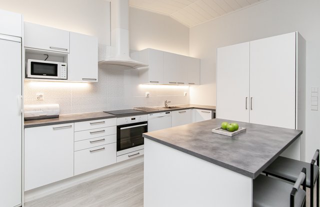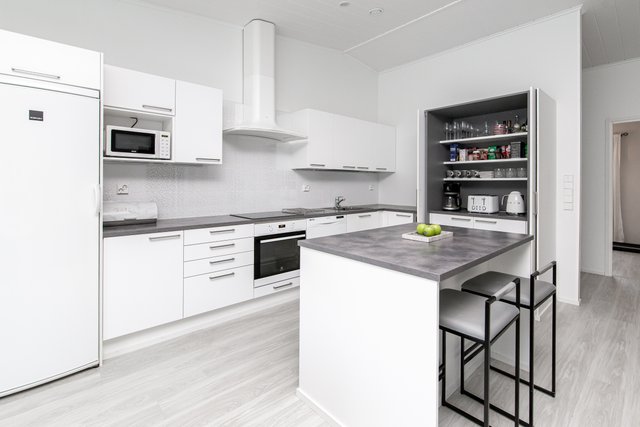 - Jääkaappi, erillinen pakastin, uuni, liesi, liesituuletin, astianpesukone, keittiösaareke, mikroaaltouuni, ja viinikaappi