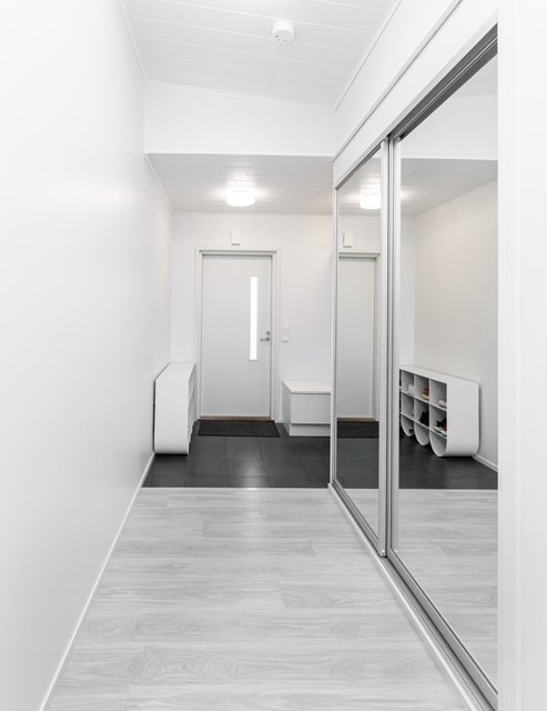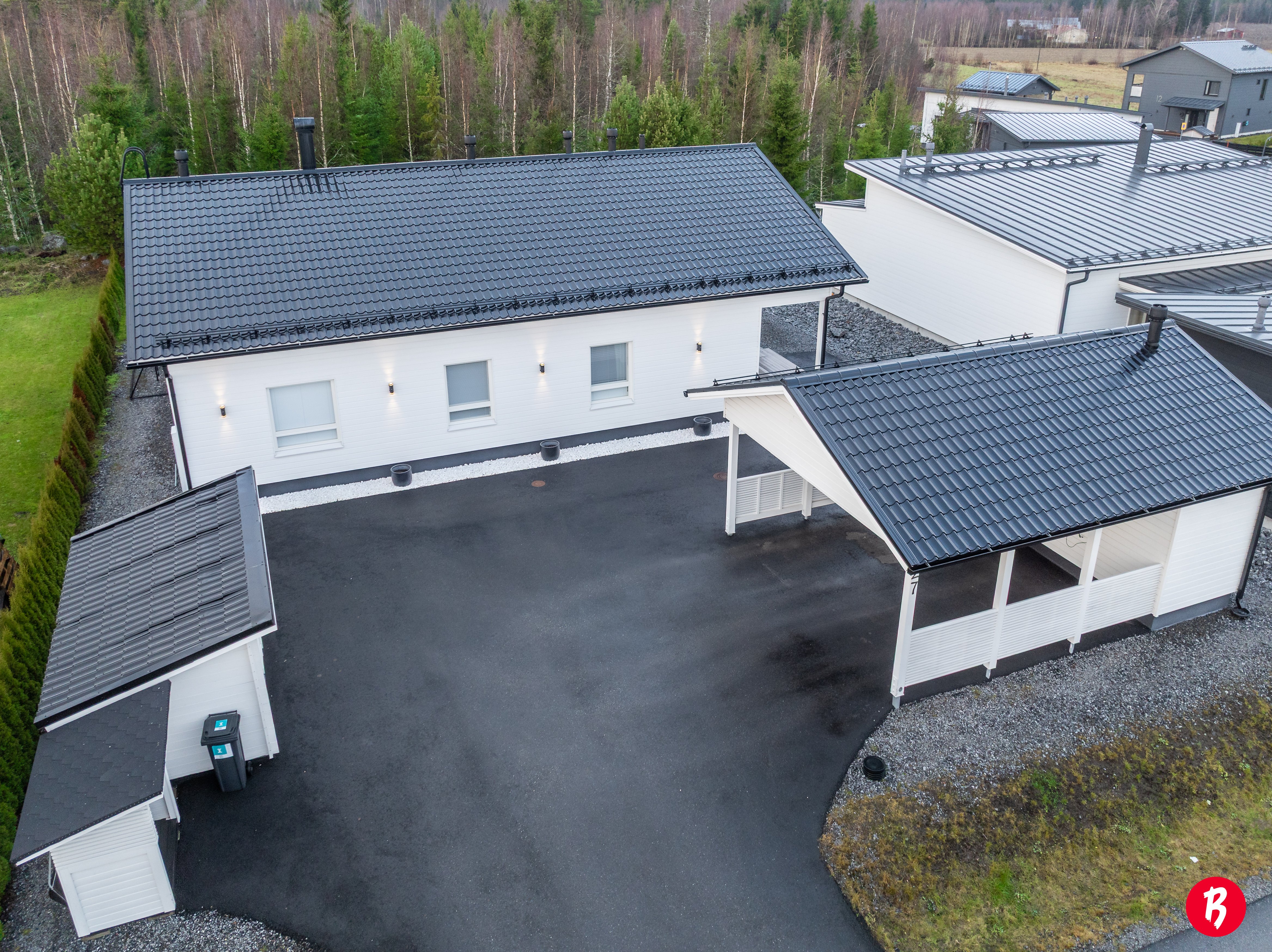 Talon hyvä ja toimiva pohjaratkaisu on suunniteltu perheen tarpeisiin, sisältäen neljä makuuhuonetta, kaksi erillistä wc:tä sekä tilavan kodinhoitohuoneen, josta on oma uloskäynti. Keittiö on varustettu nykyaikaisilla laitteilla ja saarekkeella, mikä tekee siitä täydellisen paikan perheen yhteisiin ruoanlaittohetkiin. Olohuoneen ja keittiön yhtenäinen tila luo mukavan ilmapiirin yhdessäoloon. Ulkona on tilava terassi, joka kutsuu nauttimaan kesäpäivistä ja pihalla sijaitseva lämmin varasto tarjoaa runsaasti säilytystilaa.