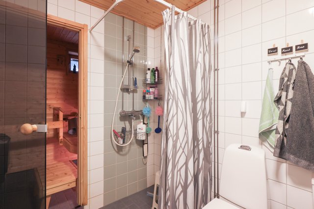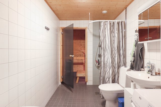 - Suihku, pesukoneliitäntä, peilikaappi, pesuallas, wc-istuin, ja bidee-suihku