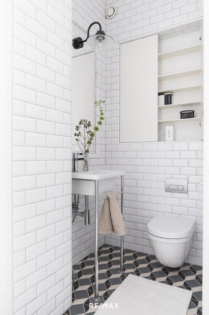 - ERILLISEN WC: VARUSTUS: - Metrolaatat seinissä, tilattu Ranskasta - Tilaustyönä valmistetut lattialaatat - Sähköinen lattialämmitys - Duravitin kalusteet: (allas, wc-istuin, peilit) - Seinään upotettu puusepäntyönä tehty kaappi - Helat Ranskasta