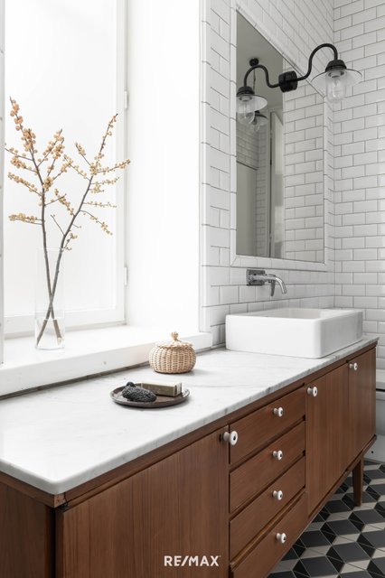 - PESUHUONEEN VARUSTUS: - Pariisista tuodut laatat seinissä - Tilaustyönä valmistetut lattialaatat - Sähköinen lattialämmitys - Duravitin kalusteet: (wc-istuin, amme, suihku, suihkuseinä) - Integroitu siivouskaappi, jossa on pesukoneliitäntä - Marmorityötaso ja piilotetut sähköpistorasiat - Pyyhekoukut Ranskasta
