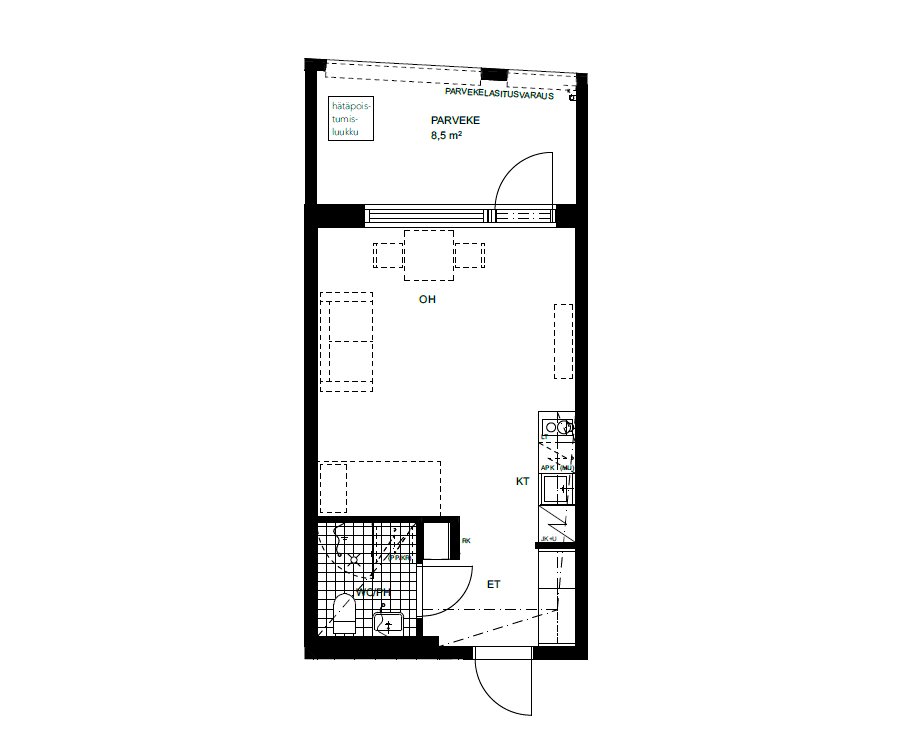 Keittiö on moderni ja hyvin varusteltu: integroidut kodinkoneet, induktioliesi ja runsaasti säilytystilaa tekevät ruoanlaitosta vaivatonta. Olohuone ja makuutila yhdistyvät toimivaksi kokonaisuudeksi, joka sopii niin yhdelle asukkaalle kuin pariskunnalle.