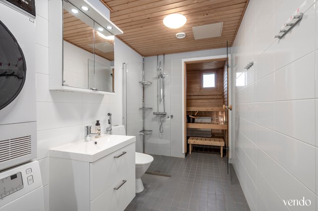 - WC-istuin, suihku, suihkuseinä, pesukoneliitäntä, peilikaappi, allaskaappi, pesuallas, ja bidee-suihku