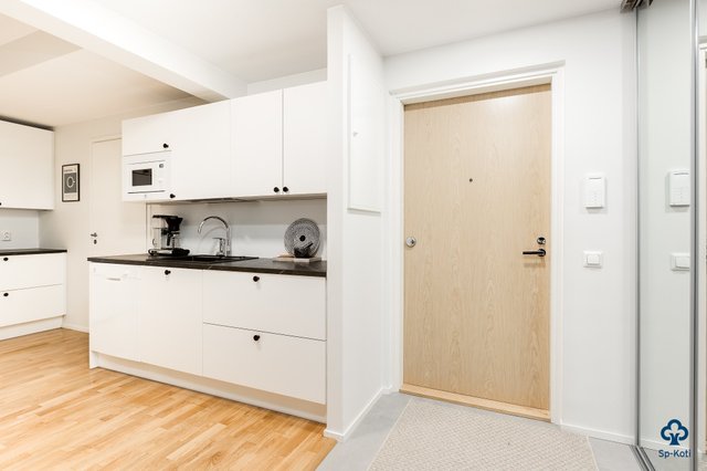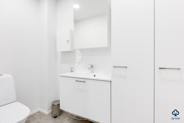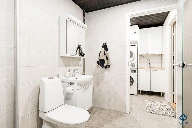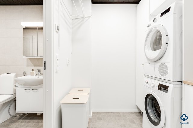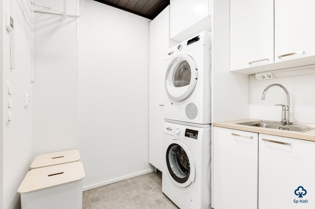 - Pesukoneliitäntä, pesuallas, lattialämmitys, tila pesutornille, ja siivouskaappi, allaskaapistot