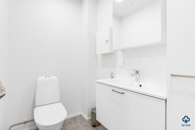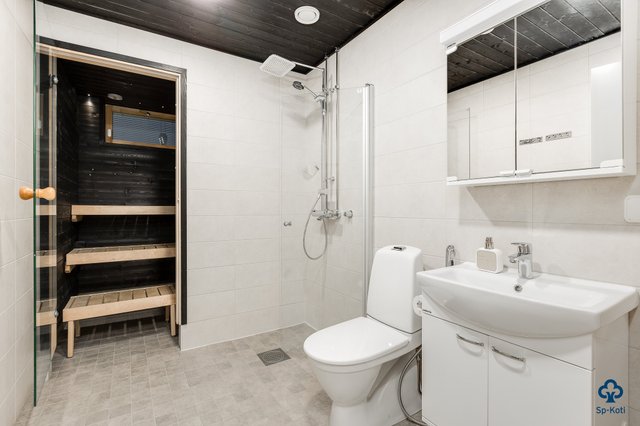 - WC-istuin, suihku, suihkuseinä, lattialämmitys, peilikaappi, pesuallas, allaskaappi, ja bidee-suihku