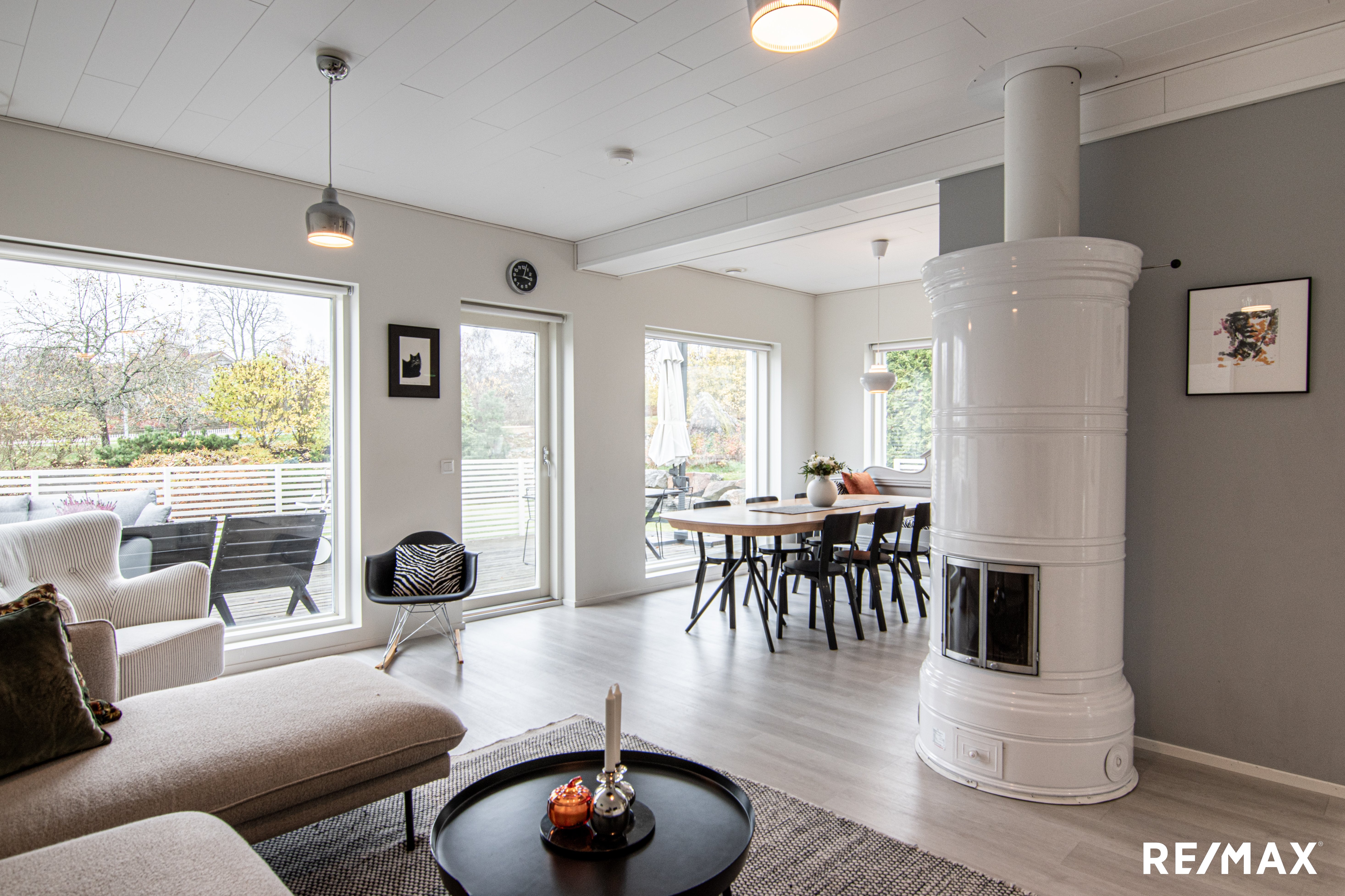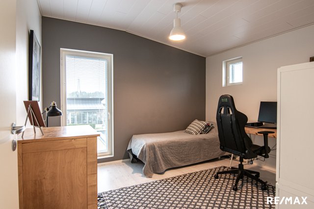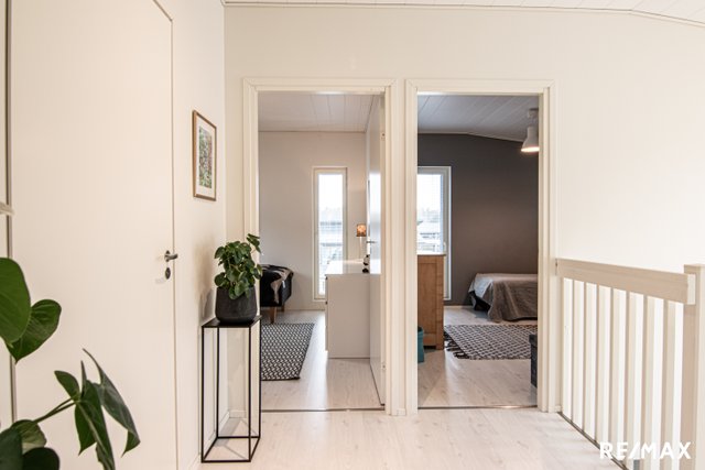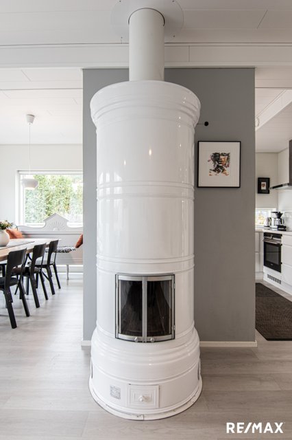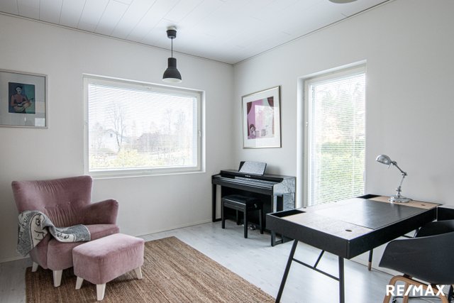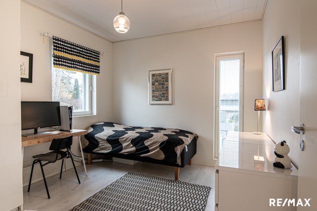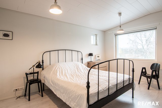 Yläkerrassa sijaitsevat neljä tilavaa makuuhuonetta sekä kylpyhuone – täydellinen kokonaisuus lapsiperheelle tai etätyöskentelyyn. Lämmityksestä huolehtii energiatehokas poistoilmalämpöpumppu (PILP), ja tunnelmaa viileneviin iltoihin tuo varaava takka.