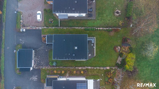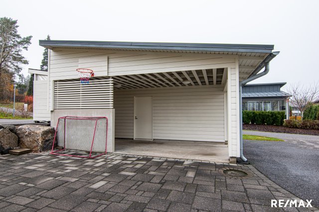 Talousrakennuksesta löytyy autokatos ja reilusti kylmää varastotilaa. Lisäksi pääsisäänkäynnin yhteydessä on tilava lämminvarasto. Piha on viimeistelty asfaltoinnein ja kiveyksin, mikä tekee pihanhoidosta helppoa ja siistiä.